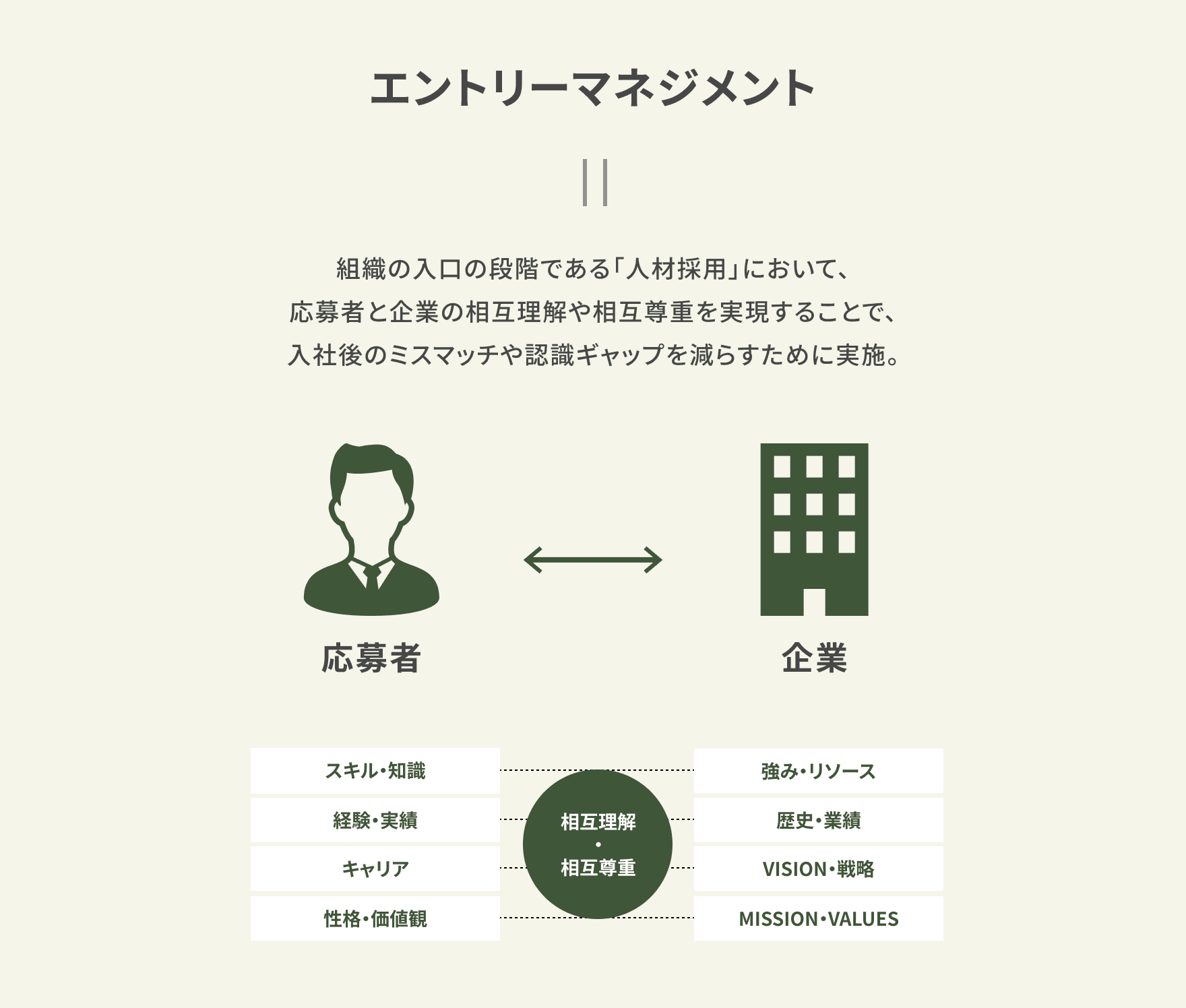 エントリーマネジメントとは、「自社に合う人財を、ブレなく採用する」ための基盤です。個人にも組織にも、三者三様のリソース・ビジョン・価値観があるため、入口の段階でお互いがそれを理解し合い、尊重し合えることで、未来を共創していく関係を構築することが可能となります。