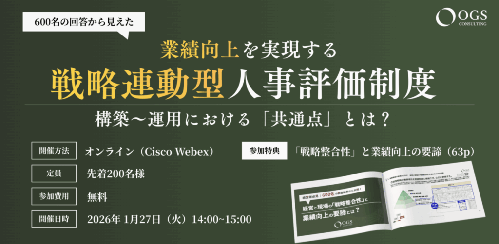 戦略連動型の人事評価制度構築を基軸とした、本質的な組織開発を支援するOGSコンサルティング株式会社(本社:大阪府大阪市中央区、代表取締役社長:深石 圭、以下、「OGSコンサルティング」)は、この度、京都銀行様が主催する事業者向けオンラインセミナーに登壇いたしましたことをお知らせいたします。