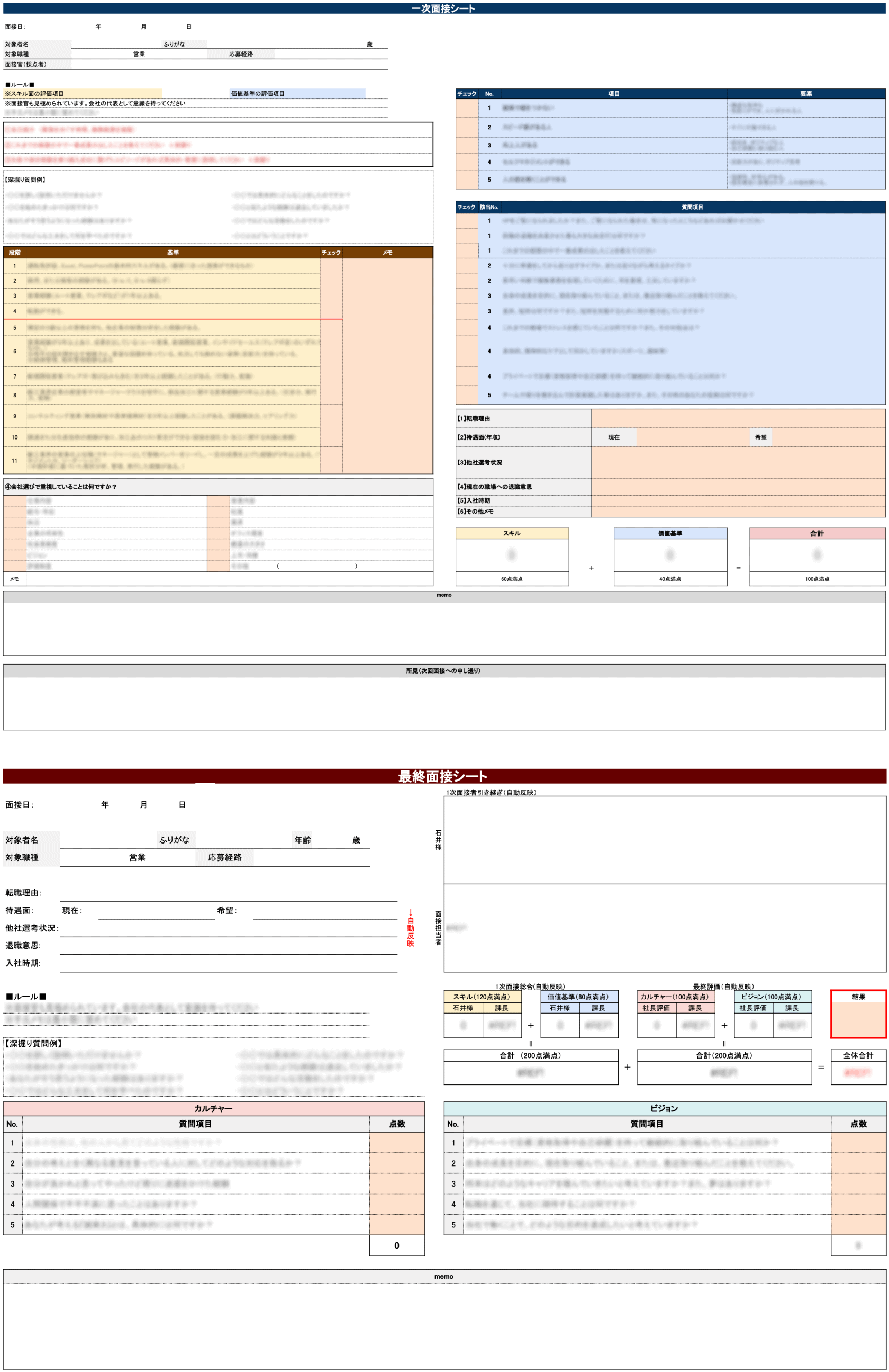 また、STEP②で明確化した評価基準に基づき、質問項目・評価項目を整理した面接シートの設計も支援いたします。